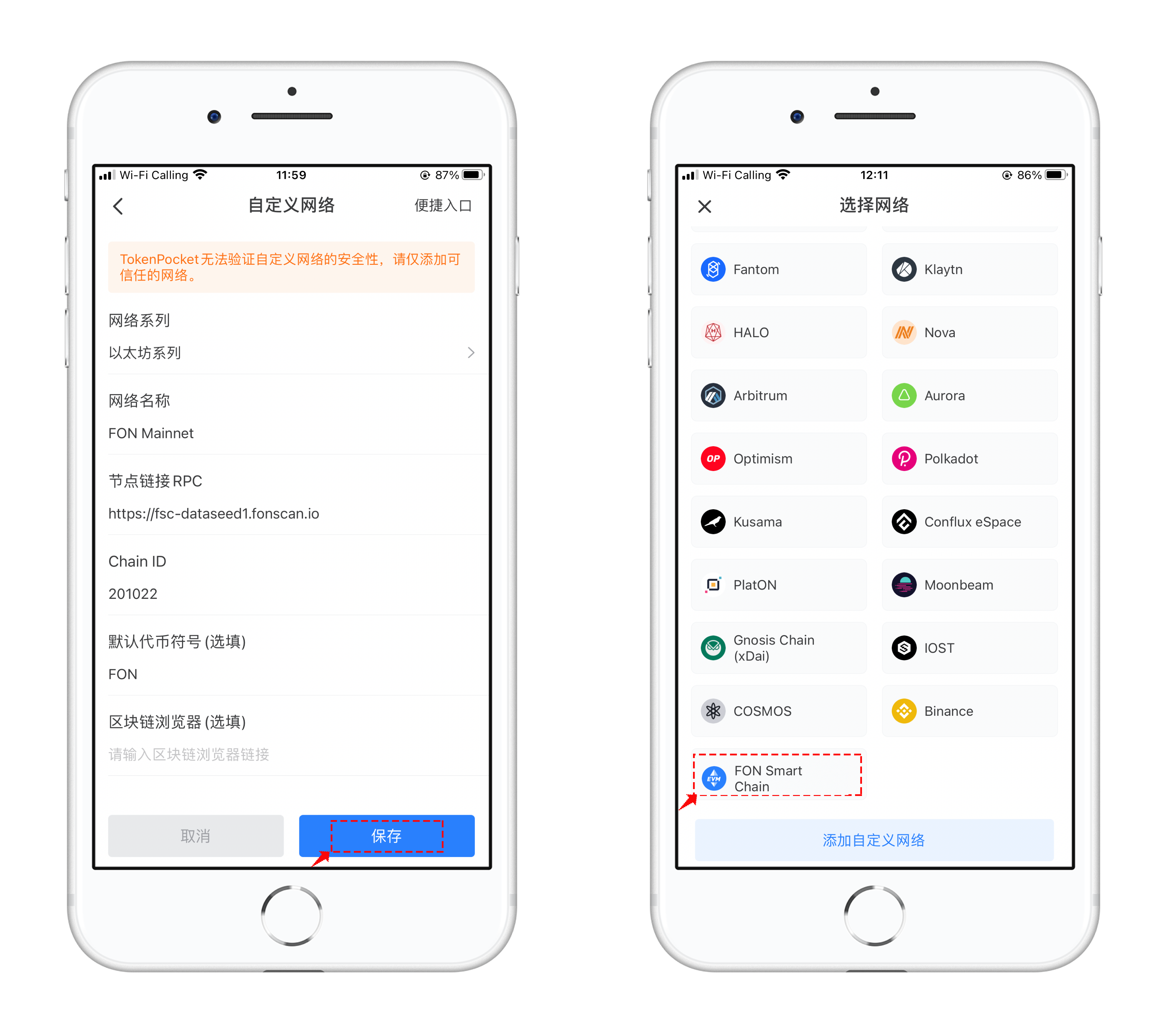 3、核对信息后点击右下角的【保存】，即可添加成功。回到选择网络界面，下拉到最底部可以看到新添加的 FON Smart Chain 网络。